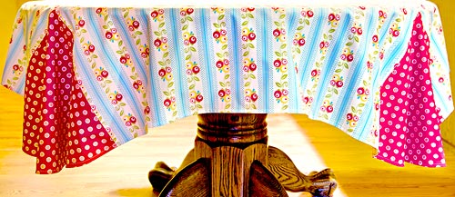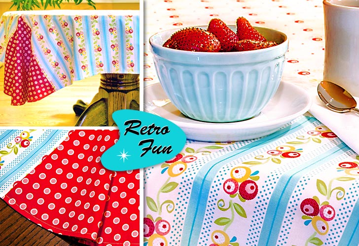 This delightful reversible tablecloth is two-two-two tablecloths in one. The top is created with three fabrics (originally from Barbara Jones’ Simply Sweet collection). The back is a soft egg-yolk yellow with an accent kick of Simply Sweet for the flounces. Each corner comes together like a perfect four-way intersection… without the stop sign, of course. The blend of vintage patterns and colors makes us want a bowl of Maypo or, at the very least, some Ovaltine.