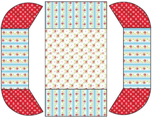 - From the fabric for the top corner flounces (the Simply Sweet Jumbo Dot in our sample), use the pattern to cut four flounces.