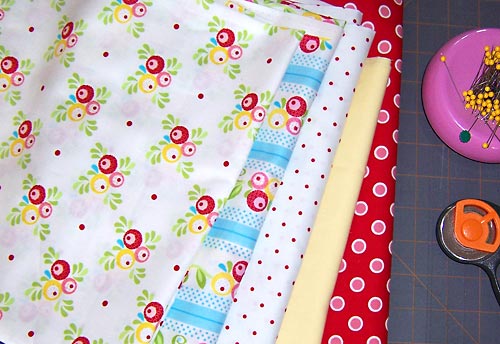 - Fabric for the top corner flounces: 1½ yards of 44″+ wide fabric: we originally used Barbara Jones’ Simply Sweet in Jumbo Pink Dot on Red for Henry Glass & Co. Fabric