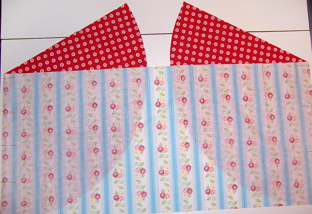 - Using a ½” seam allowances, sew the flounces and side panels together to create two three piece units. START the stitching ½” from the point of the flounce. Press seam allowances open.