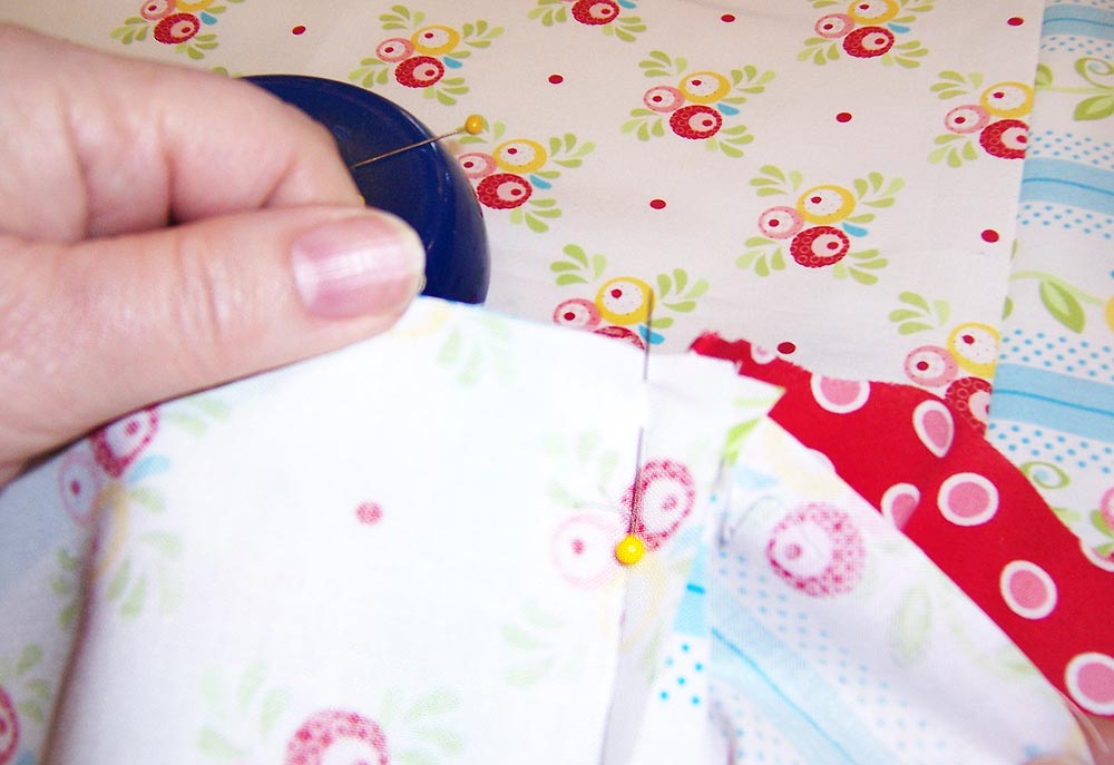 - Using these pins as your guide, pin the center section of side unit to the center section of the center unit, corner to corner, right sides together.