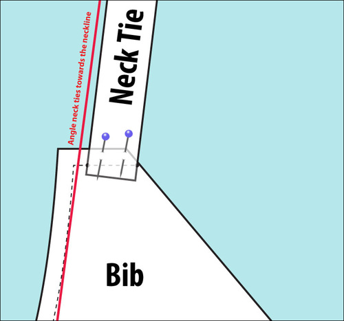 - Layer the two sets of bib panels right sides together, sandwiching the ties between the layers. Pin across the top and along the armhole curve. The bottom edge and the inner diagonal edge remain un-pinned and un-sewn. Remember to pull the tie out of the way of the seam.