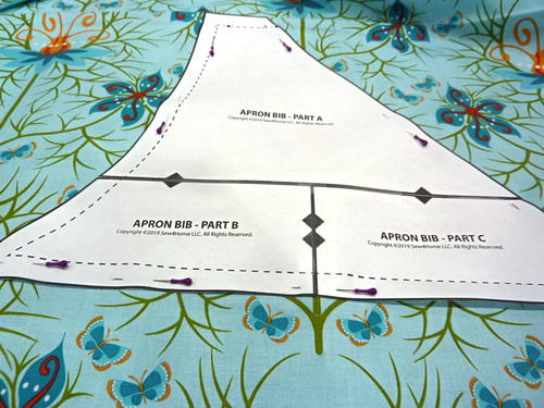 We offer a full pattern download below for both the bib and the pocket. If you print the pattern on a slightly see-through paper (or trace it from paper to tissue) it can help you expertly fussy-cut the segments, including matching each pocket to its background panel should you choose that option. There are detailed steps below as well as links to our full tutorials on both fussy cutting and pattern matching.