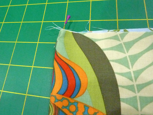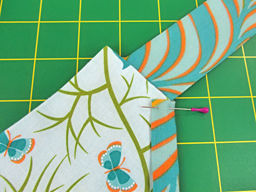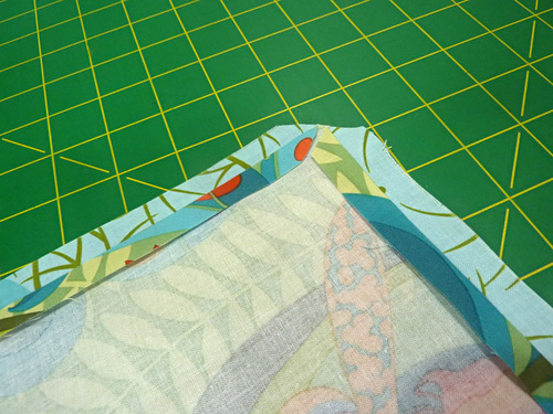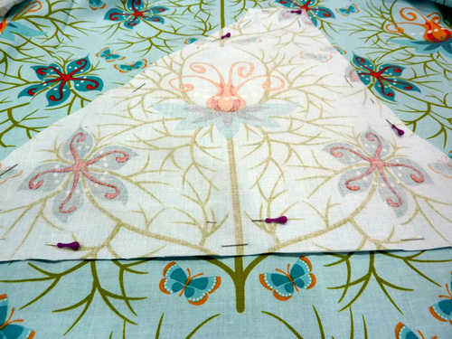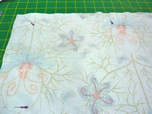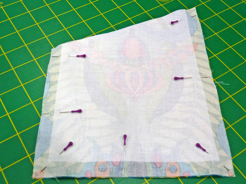- Place the interfaced and plain pocket panels right sides together. Pin along both sides and across the bottom. The diagonal edge remains un-pinned and un-sewn.