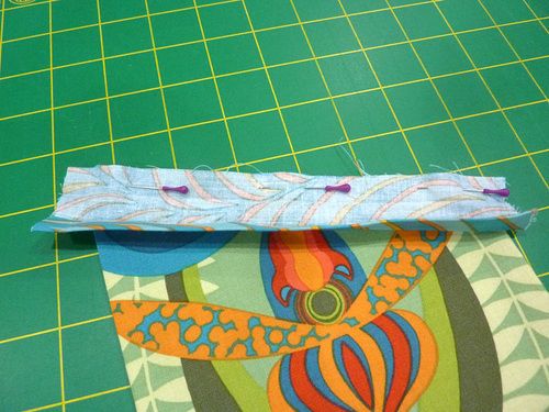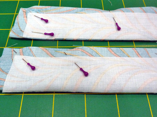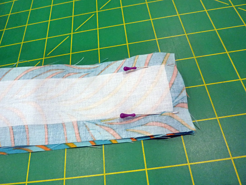 NOTE: You could choose to interface both sets of three. The FreeSpirit Nouveau fabric is very high quality and so we opted to use just one layer of interfacing. - Pin a tie strip to either side of each waistband strip.