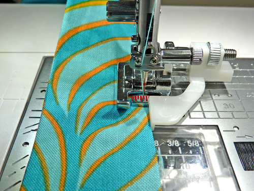 - With both lengths of binding folded and pinned in place. Edgestitch the binding in place from the bottom up to the top. We switched to a standard Satin Stitch foot, but the Janome Edge Guide foot would be another great option. The stitch length should be slightly lengthened to match your other edgestitching.