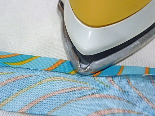 - Fold each strip in half lengthwise, wrong sides together, and press to set a center crease line. Unfold wrong side up so the crease line is visible. Fold in and press each long side to meet in the middle at the crease.