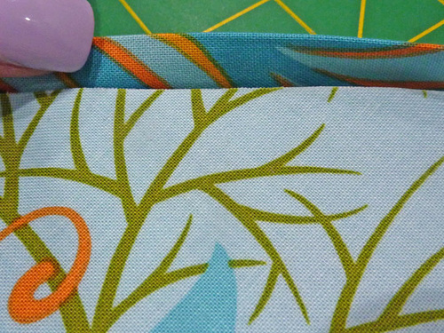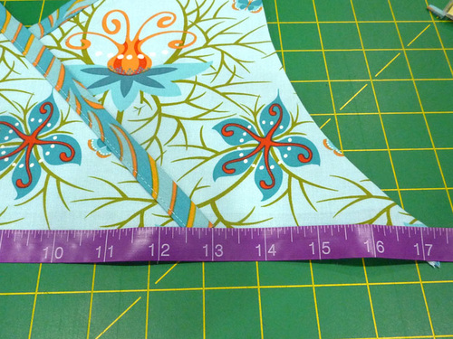 - The binding should be flush with the bib at the bottom, but at the top there will be about ½” extending beyond the top. At this top end, fold back the raw edge ½” and then cut in the corners at a diagonal as shown in the photo below. This allows a cleaner finish at the end.
