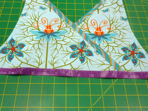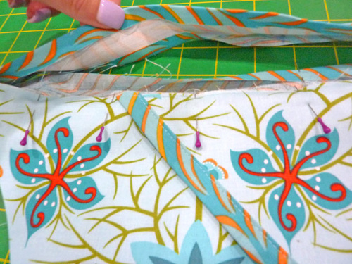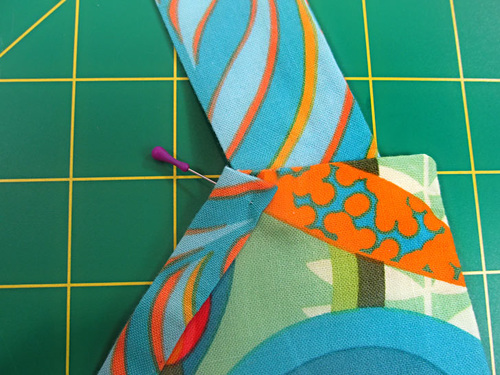 - Find the two 13” lengths of binding. Slip a binding length over the raw edges of the inner diagonal for each side of the bib.