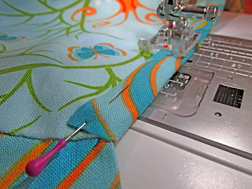 - Re-set the stitch length to normal. Using a ½” seam allowance, stitch across the top and along the armhole curve. Remember to pivot at the upper corner.