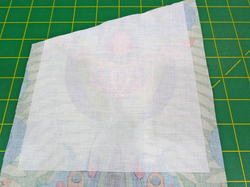 - Find the two pocket panels and the coordinating panel of interfacing. Place the interfacing on the wrong side of one pocket panel, centering it so the interfacing is flush with the fabric along the diagonal and there is ½” of fabric showing beyond the interfacing on the other three sides. Following manufacturer’s instructions, fuse in place.