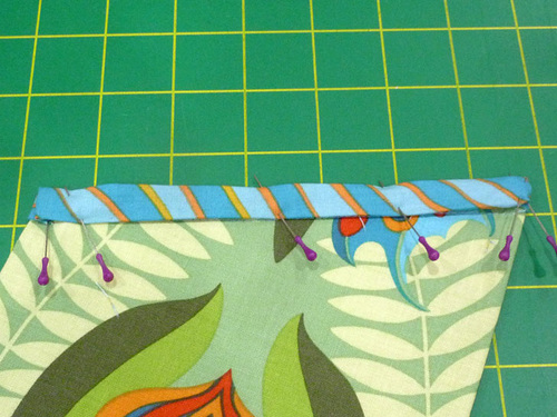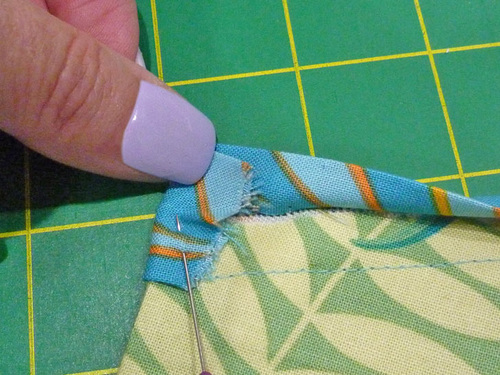- Wrap the folded edge of the binding around to the back of the pocket. At each end, wrap the raw end around the side of the pocket, tucking it under the binding to create a clean finish at each end.