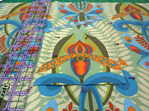 We picked a dominant motif to center within the Bib pattern. First cutting one side…