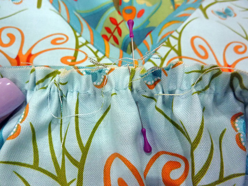 - Pull the threads to gather the skirt to 22″ wide. Adjust the gathers as needed so they are even from the center point out to either side.