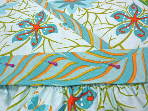 The diagonal edges of each bib panel as well as each pocket are bound with an accent fabric, the same fabric used for the ties and waistband. You’ll notice the interesting angles created at the top of the bib where the neck tie, bib, and binding come together. It echoes the classic geometric angles often used in Art Nouveau design.