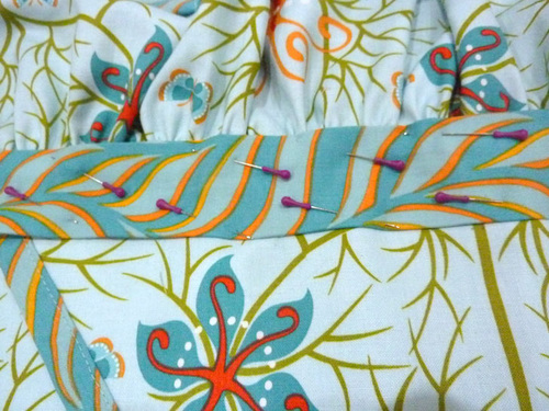- Pin and then machine baste both ties in place.