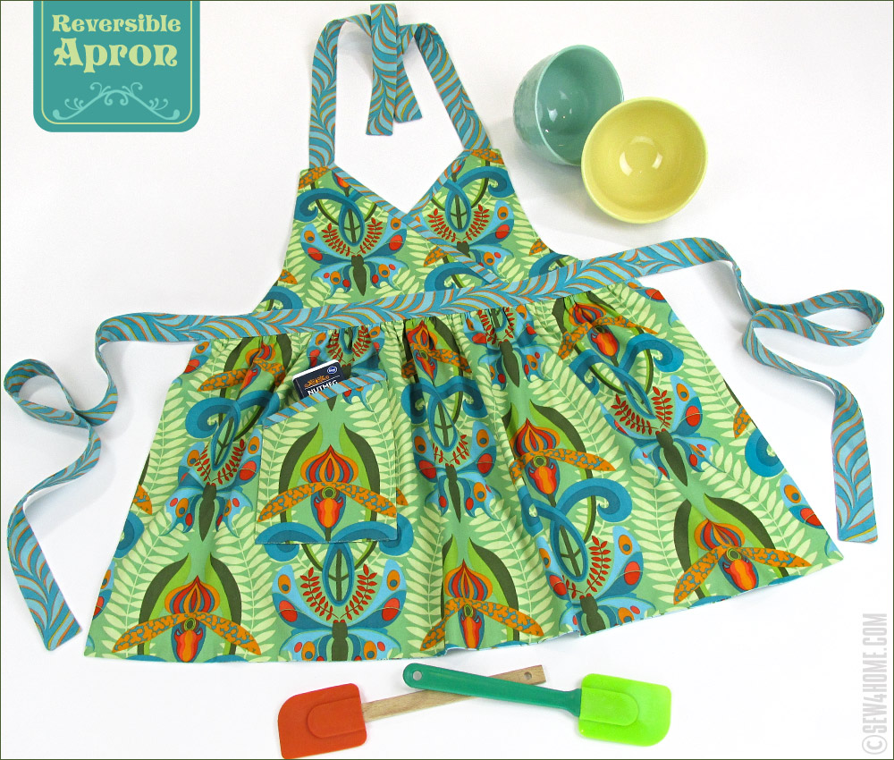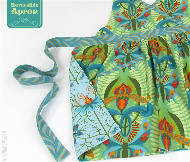Our reversible apron features two of the most vivid fabrics within the collection: Love in the Mist and Wild Orchid, both in the Autumn colorway. These are framed with a lovely repeating wave fabric, Favrile Flow for the ties and binding. As always, you can choose different favorite fabrics to create the apron with equally beautiful results.