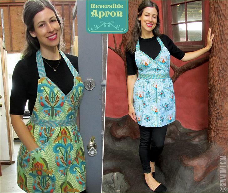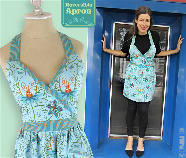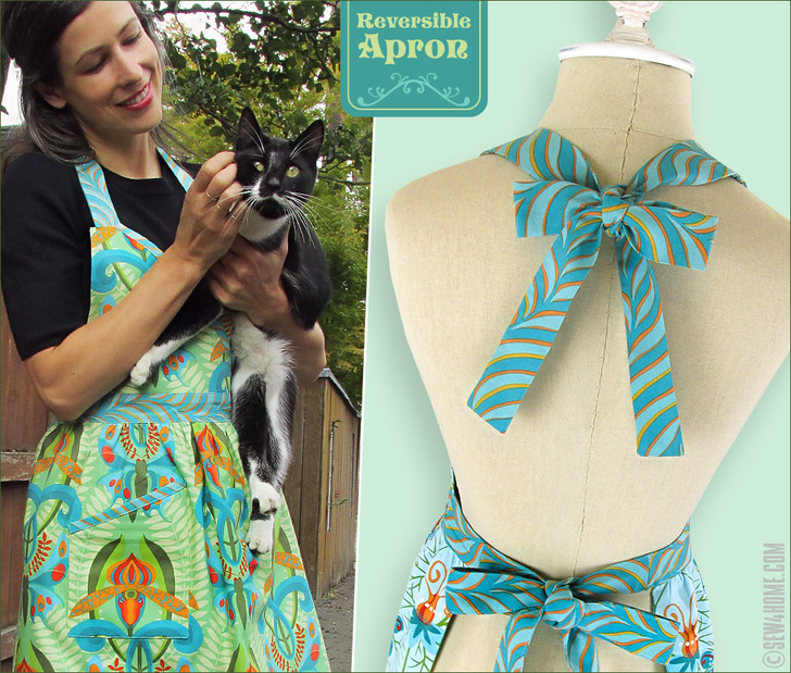 As with store-bought aprons, our design is meant to be one-size-fits-all. However, we realize you may still wish to make yours smaller or larger. As a reference, this reversible apron is approximately 17″ wide across the bottom of the bodice, the waist ties are each approximately 33″ long and are attached to either side of the 22” waistband section, the neck ties are each approximately 27″ long, the main skirt length is about 16″, and the bodice is about 9″ high at the highest point at each strap and about 5” high at the center crossover.