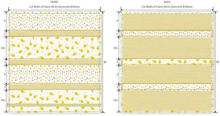 - Repeat the steps to add one additional set of 11½” wide panels (Kitten front/Stripe back) and one additional set of 10” wide panels (Diamond front/Stripe back) separated by one additional set of 4” narrow panels (Stripe front/Diamond back). As you can see in the drawing above, the topstitching through all the layers is always done in the uppermost panel, the panel towards which all the layers are pressed.