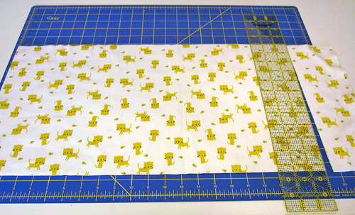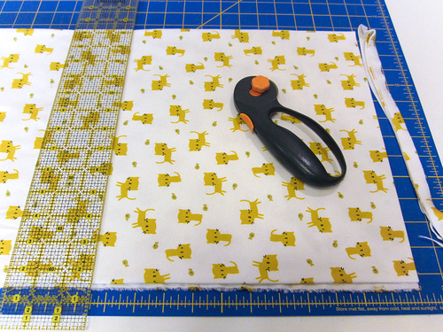 - Center the folded Stripe strip, which is now 1”, right side up on the Kitten panel so the ends of the accent strip extend beyond the Kitten panel on either side. The bottom folded edge of the accent strip should sit 4” up from the bottom raw edge of the Kitten panel. Pin the accent strip in place down its center.