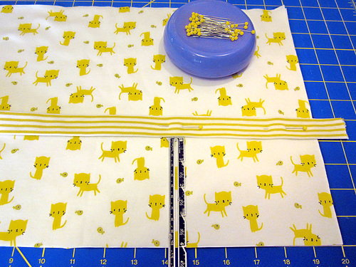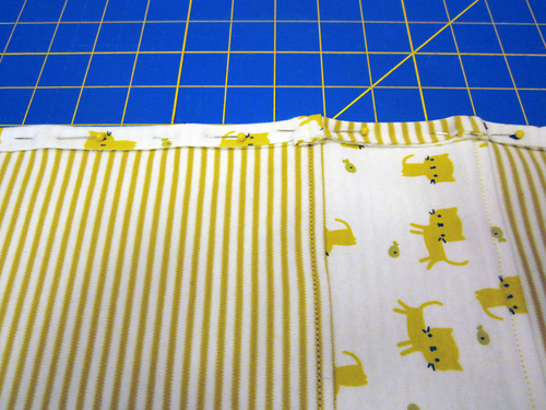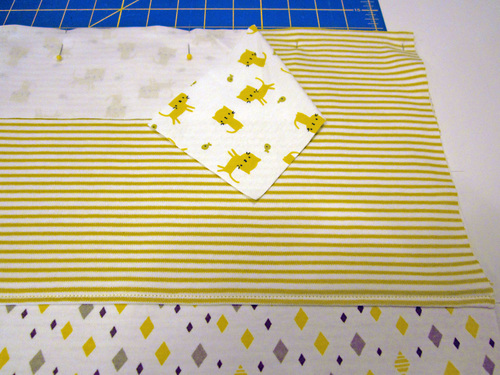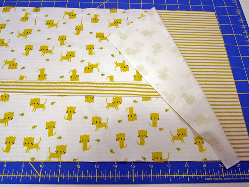 - Find one of the 4” Stripe panels. Place it right sides together with the front Kitten panel, aligning the top raw edges. Re-pin along the top edge through the three panels.
