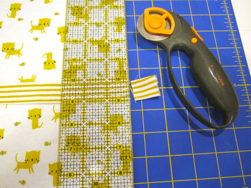 ONE 2” x WOF strip for the front accent band - The striped knit is easiest to cut using scissors, allowing you to follow the stripes. Select a starting stripe and cut across on that stripe to square the fabric.