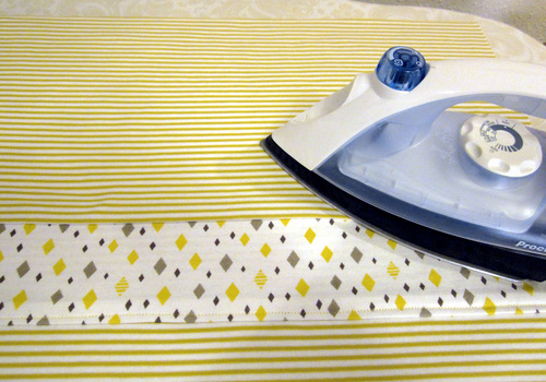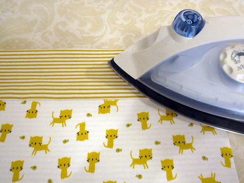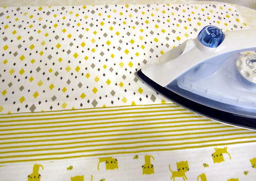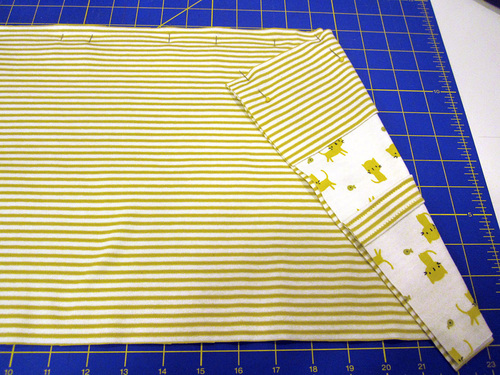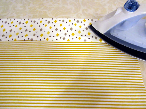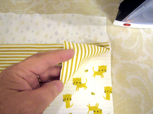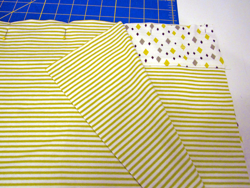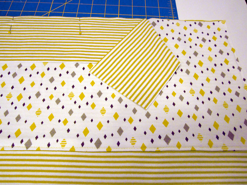 - The knit fabrics do not ravel, so we made a simple, single turn hem along all four sides. This also helps keep bulk to a minimum along the edges – especially along the doubled horizontal seams.