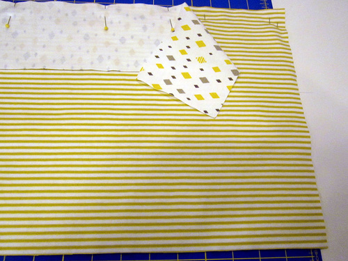 - Find one of the 4” Diamond panels. Place it right sides together with the back Stripe panel, aligning the top raw edges. Re-pin along the top edge through all four panels.