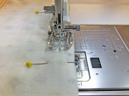 - Place the Diamond panel right sides together along the top raw edges of the narrow Stripe/Diamond panels. All three raw edges should be flush. Pin in place through all three layers.