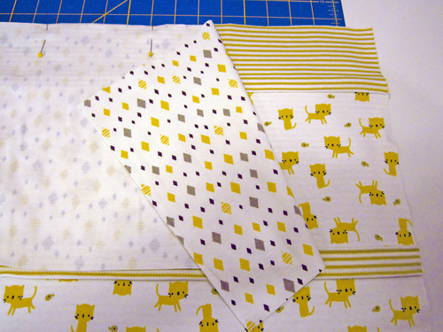 - Find the next set of narrow panels (Stripe for the front and Kitten for the back on our sample). Place the front narrow Stripe panel right sides together with the wide Diamond panel, aligning all the top raw edges. Pin in place through all three layers.