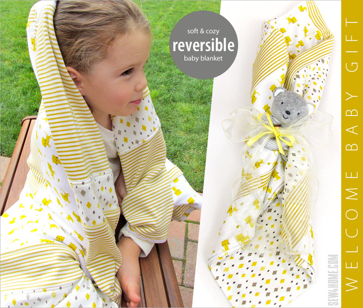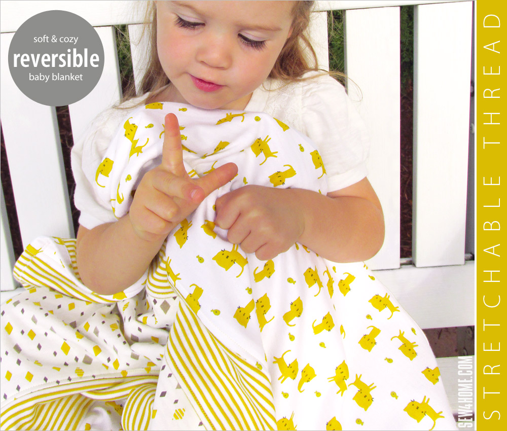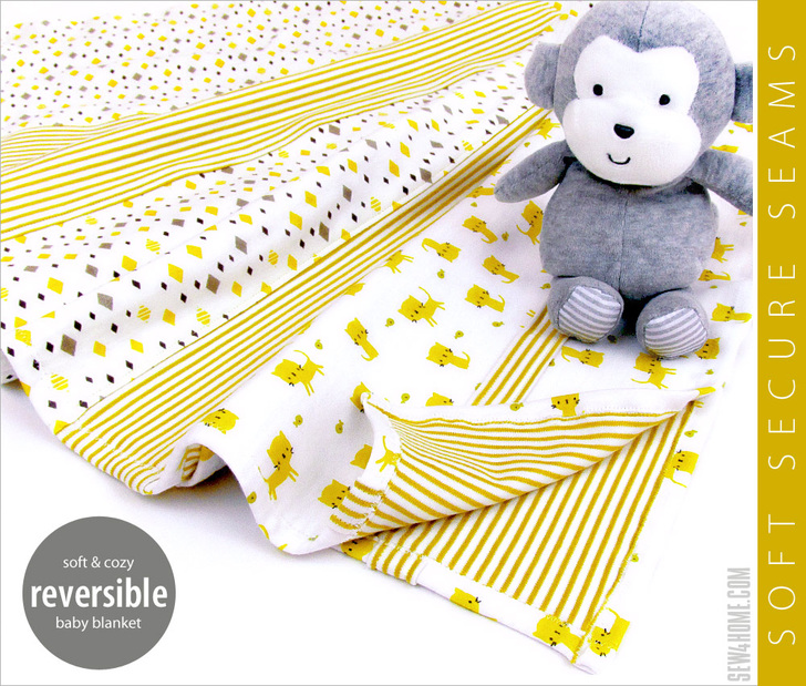 Soft and sweet describes this easy to assemble knit blanket. Made from 15 wide and narrow panels in three coordinating knits, the blanket layers together in a snap. We used Eloflex stretchable thread from Coats, which kept our seams and hem flat and pucker-free. The blanket’s panels are cleverly sandwiched and topstitched so all the horizontal seams are finished front and back.