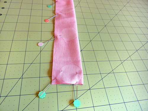- Pin well, making sure your ties don’t shift position. If you are unsure of your pinning accuracy, you could baste the ties in place prior to layering the back with the front.