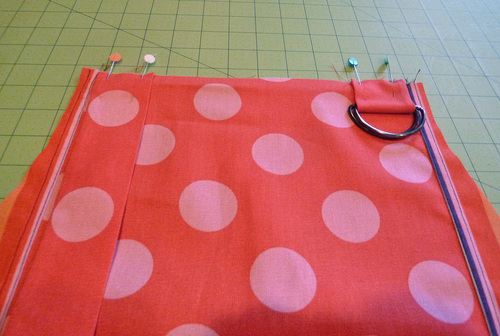 - The D-rings’ loop should be pinned at the top upper right, ½” in from the right side. Thread both D-rings onto the loop. Fold the loop in half. Pin the raw edges of the loop in place so they are flush with the top raw edge of the apron.