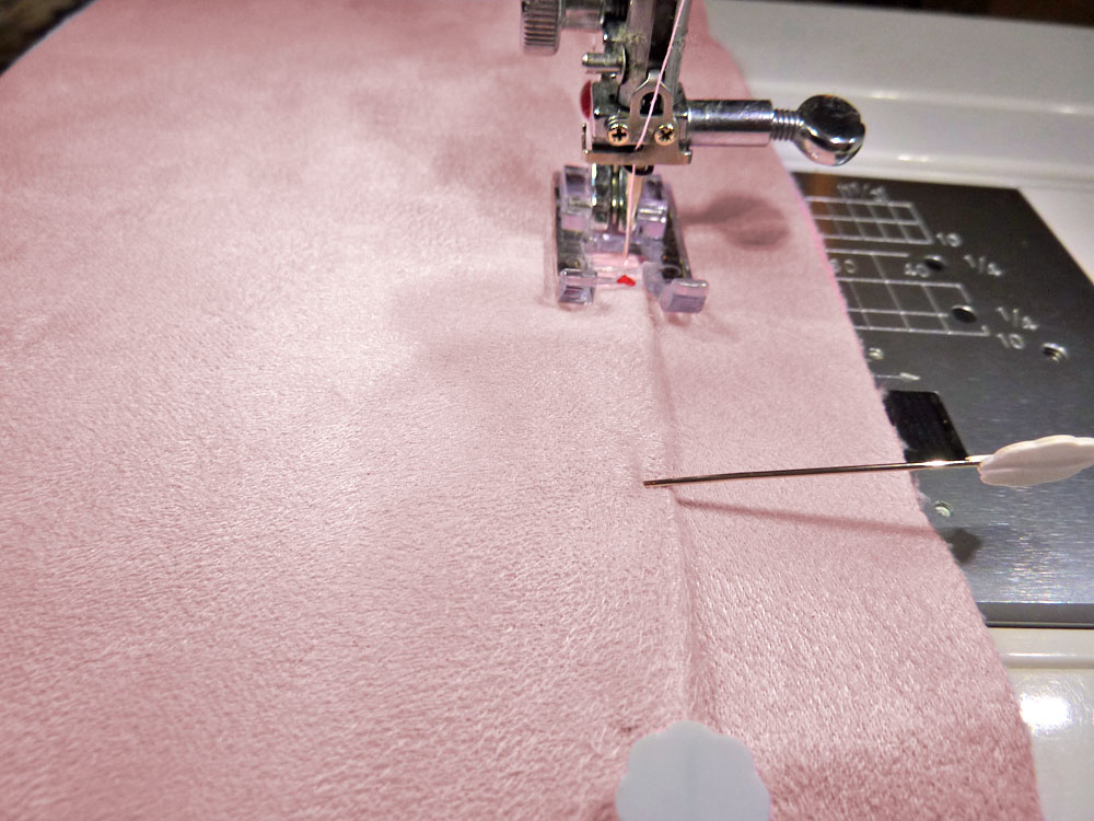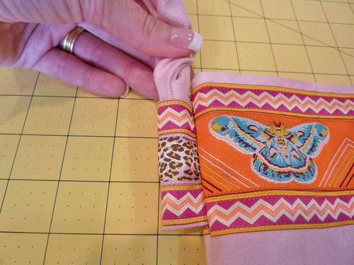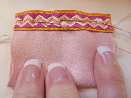 NOTE: On the pockets, the thickness of the faux suede does not require a lining, but we still want a clean folded edge top and bottom. By folding the fabric to the front and hiding its raw edge with the ribbon, we create that clean folded edge along the top with just one layer of fabric.