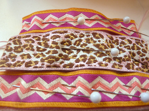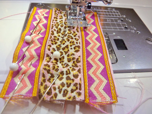 - Butt one Leopard ribbon against the first ribbon and pin in place.