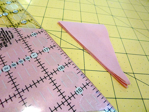 - Using your clear ruler and rotary cutter, slice off the end at a diagonal through all four layers.