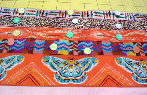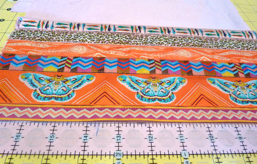 - Cut the 1½” Orange/Aqua Moths into THREE 12″ lengths, being particularly careful to center the moth motifs within each strip.