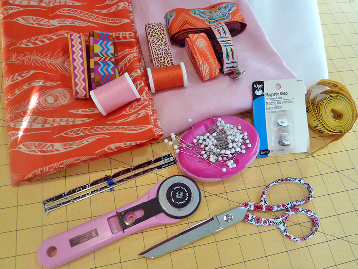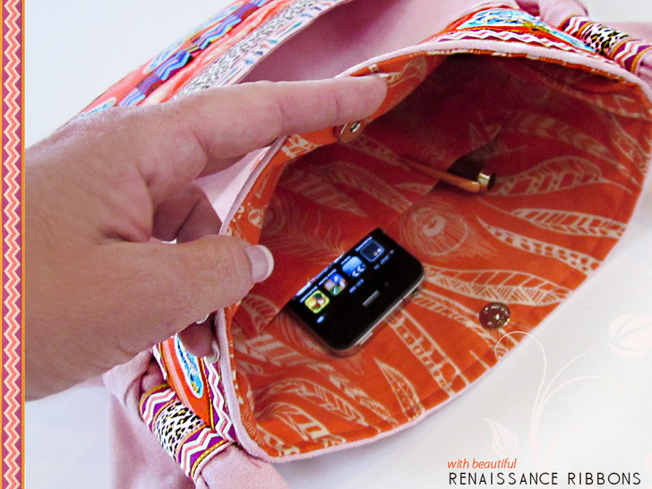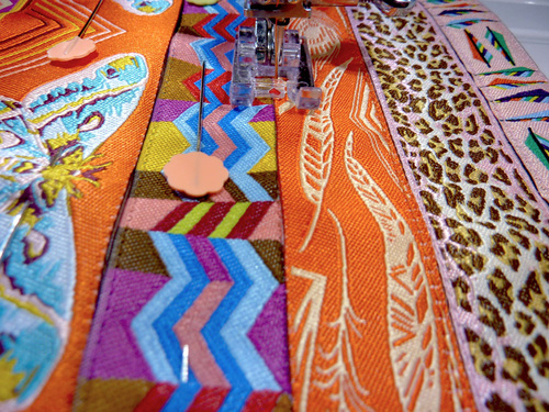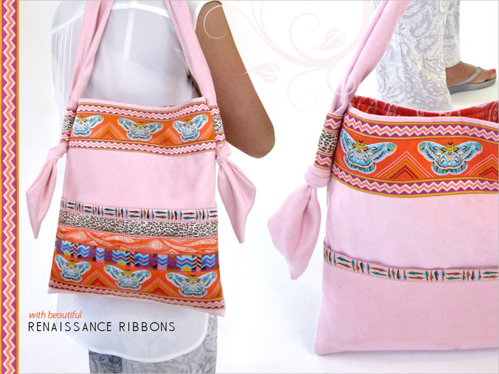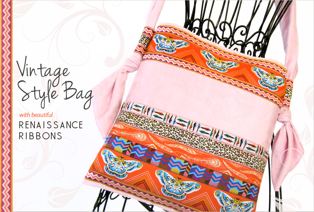 The specific ribbon selection is what will create your bag’s signature spirit. Although our exact ribbon combination is no longer readily available, there are many, many others from which to choose at Renaissance Ribbons. As you browse their site, you’ll recognize many of your favorite fabric and surface designers, such as Tula Pink, Kaffe Fassett, and Mary Engelbreit.