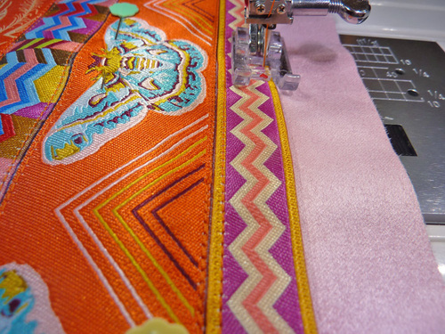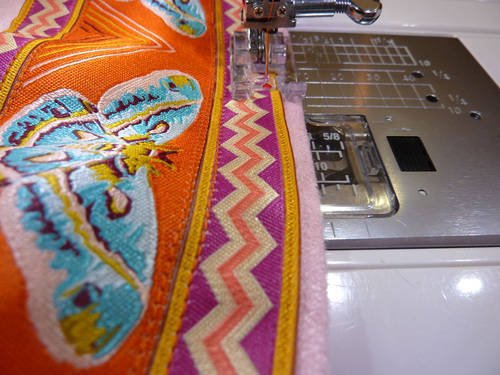 - Topstitch through all the layers all around the top of the bag. Your seam should follow along in the previous edgestitching seam that adhered the top decorative Meander ribbon to the front and back panels.