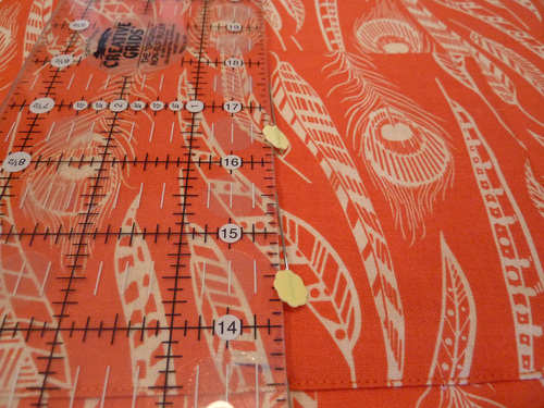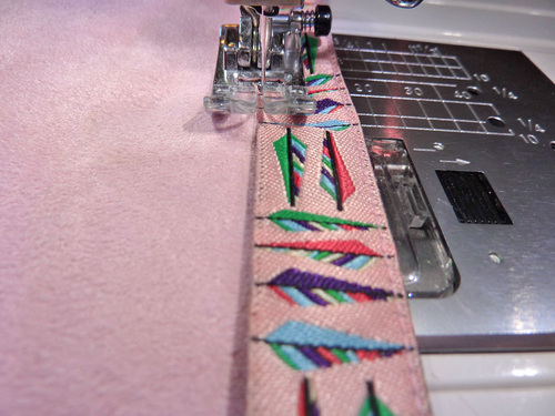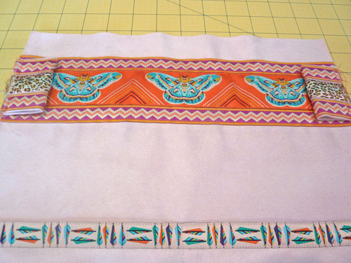 - This back pocket has just one Arrow Feathers ribbon across the top. Edgestitch it in place in the same manner as above.
