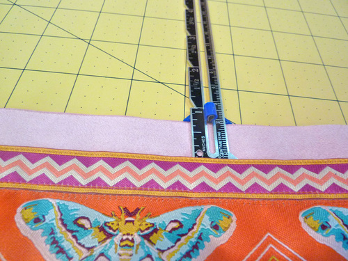 - Place the first Meander ribbon ¾” from the top raw edge of the exterior panel.