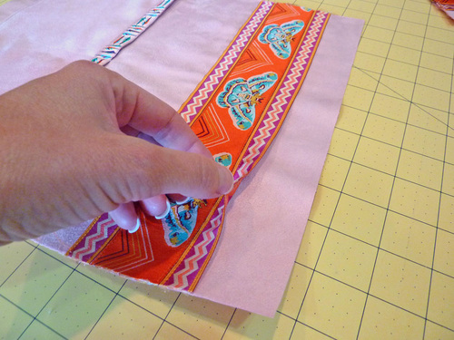 NOTE: In some of our pictures the top Meander ribbon appears father away from the top raw edge than the stated ¾”. Not to worry; we really mean ¾”. We had to adjust some sizing along the way as we worked with the exact widths of the ribbon and so trimmed down our exterior panels after the fact. You should work with the measurements as stated within the instructions. - Find the two ribbon tabs. Find the exterior back panel with all its ribbons stitched in place.