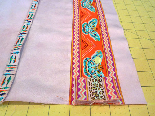 - Butt the remaining Meander ribbon against the Leopard ribbon and pin in place. The bottom of this Meander ribbon should be flush with the bottom seam of the fabric. The side raw edges of the fabric and ribbon should be aligned as well. These will be sewn into the seam and so remain open and raw. Trim the raw edges flush if necessary.