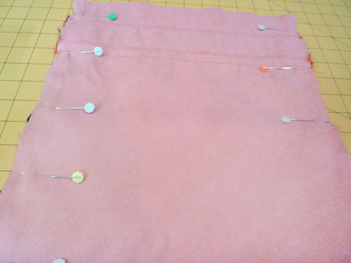 - Fold the pocket in half, right sides together, making it 8″ x 5½”. Pin along all three sides, leaving an approximate 3″ opening along the bottom for turning.