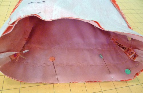 - Slip the exterior bag inside the lining bag so the two bags are now right sides together. Align all the seams and the bottom corners.