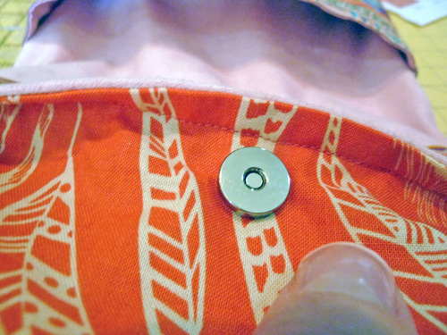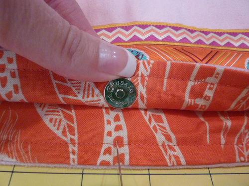 - Pull the lining out and away from the bag. Use the opening that is still in the bottom seam of the lining to reach through and insert each side of the snap.