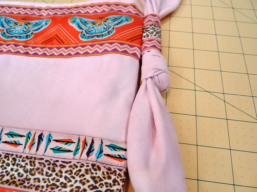 - Pull through the strap until the pointed end of the strap is aligned with the bottom of the bag. Tie a knot just below the bottom of the tab. The knot will shorten the end of the strap so the pointed end now sits approximately 3″ from the bottom of the bag. Of course, you can adjust the knot position for your best fit.