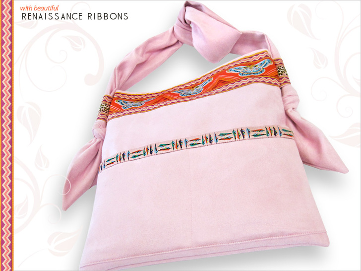 Combining the softness of faux suede with the color pop brightness of ribbon is a stunning combination. Our first choice for ribbon is Renaissance Ribbons; their jacquard ribbons are exquisitely woven, richly colored, and simply beautiful. They’re a wonderful way to instantly add intricate style to a project. For this soft shoulder bag, we chose a solid base fabric to best showcase a variety of ribbons. The faux suede supplies the proper heft to support the ribbons as well as a soft, supple texture that gives the bag its vintage style.