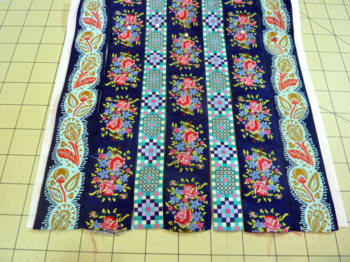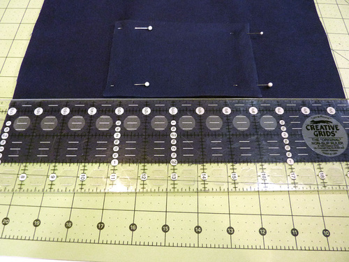 - Place the pocket on the right side of the panel. The pocket should be positioned 2½” down from the upper raw edge of the panel and centered side to side.