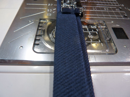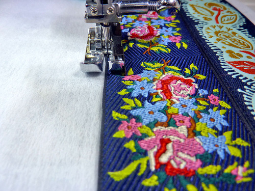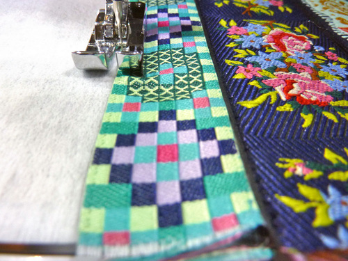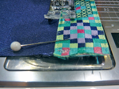 - Re-thread the machine if necessary (we did in order to use clear thread) and edgestitch the ribbon along both long sides.